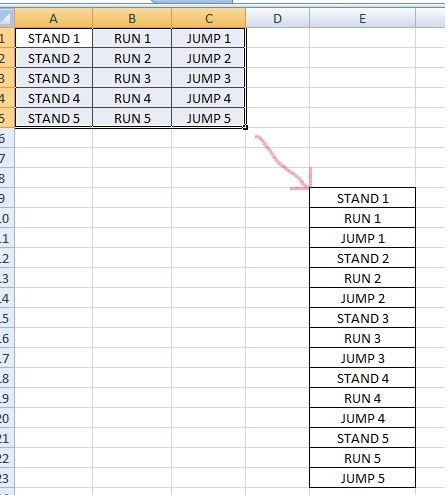KevUK Posted September 22, 2014 Posted September 22, 2014 Hi Try the following in E9 and copy down =IFERROR(INDEX($A$1:$C$5,CEILING(ROW(),3)/3,MOD(ROWS($1:1)-1,3)+1),"") I take it that you are using Excel 2007 or >, If not you will have to remove the IFERROR and use IF & ISERROR Quote