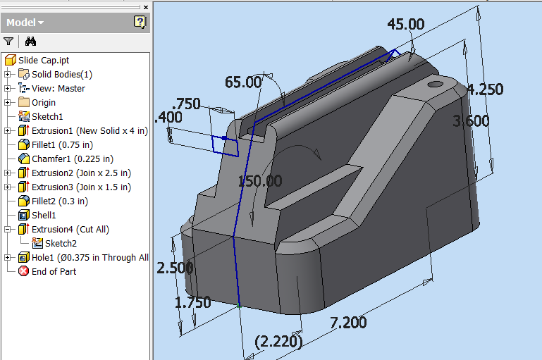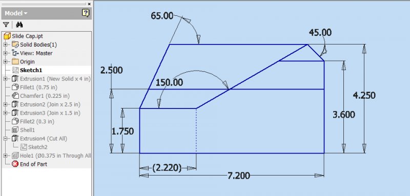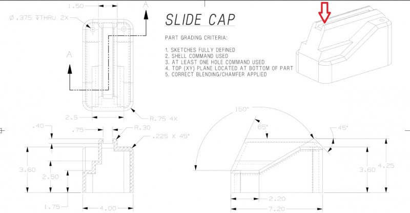 bobingham Posted October 8, 2014 Posted October 8, 2014 Hello. For my CAD assignment, I have been given the dimensions of a slide cap (see picture below). I was able to create the piece...with the exception of the part which I indicated with a red arrow. I see no dimensions provided for it. So if anyone could explain to me what parts of the drawing I need to look at to understand this part, I would really appreciate it! For my class we are using NX9 to generate the slide cap. Quote