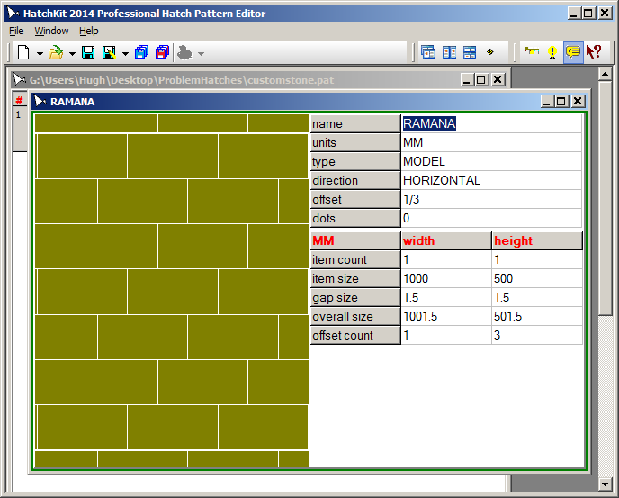 hugha Posted December 18, 2014 Posted December 18, 2014 Parameter count per line normally should be 7, you have 7/8/6/7 ... Please describe how your 500x1000 tiles are arranged - apart from the 1.5mm gap. Are they stacked or offset? As an example the pattern derived from the screenshot is : ;------------------------------------------------------------------------------- ; Written by HatchKit 2014 Professional ; HatchKit 2014 Professional© Cadro Pty Ltd 1990-2014 ; www.hatchkit.com.au/ ;------------------------------------------------------------------------------- ;-Date : 18/12/2014 ;-Time : 3:38:35 PM ;-HatchKit Version : 3.0.1.2496 ;-HatchKit Output Filetype : Revit with HatchKit Add-In ;-HatchKit Licensed To Name : hugh adamson ;-HatchKit Licensed To Organization : ;-HatchKit SerialNumber : .... ;------------------------------------------------------------------------------- ;%VERSION=3.0 ;%UNITS=MM *RAMANA,HORIZONTAL 1000mmx500mm bond=1/3 ;%TYPE=MODEL 90,0,0,501.5,-333.833333333,500,-1004.5 0,0,500,-333.833333333,-501.5,1000,-1.5 -90,1000,500,501.5,-333.833333333,500,-1004.5 180,1000,0,333.833333333,501.5,1000,-1.5 It's very easy to generate another ... hth, Hugh Adamson Cadro Pty Ltd www.hatchkit.com.au Quote