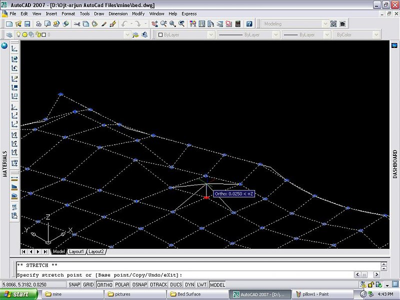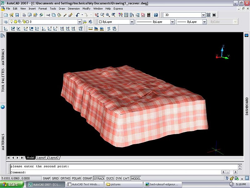 arjun_samar Posted December 19, 2008 Author Posted December 19, 2008 you will need to turn surftab1 and 2 up to help fill those seams around the edge. I would also try and soften the edges a bit. Since you are using acad07 you have loft in your arsenal so give that a shot. draw the bottom edge of the sheet(in 3d, not in a single Z coordinate) and draw "levels" of the sheet as they go up the bed. I wouldnt try to get as much "fluff" on the sheet as you have. using a certain surface and bump map will look much better. big bro.... ok thanks.. for the info... i'll check if loft can help.. thank you so much big bro... Quote