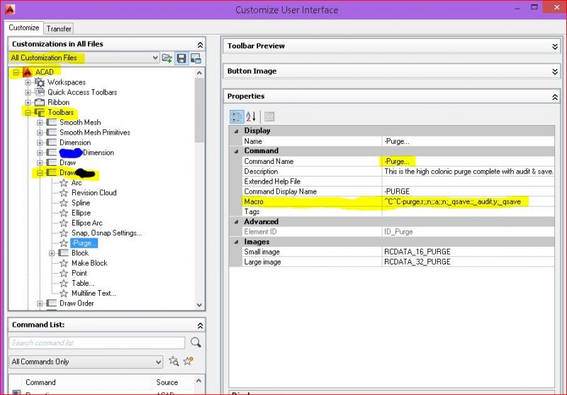 Dadgad Posted April 21, 2015 Posted April 21, 2015 (edited) Someone (who is comfortable doing it) needs to go into the CUI on your bosses software, and access the TOOLBARS. By locating that toolbar, one can right click on that icon, which will subsequently open a display on the right side of the screen which will contain the MACRO (which is the series of commands which that button initiates). Once you have that MACRO written down (exactly, or else it won't work right, spaces matter, should be left in place), then it is pretty easy to create a new button on whichever of your toolbars you would like it to be. A Macro is basically a shortened version of your commandline input to achieve a particular result. This is a custom -PURGE , AUDIT, SAVE button which I created for easy one click use. Edited April 21, 2015 by Dadgad Quote
