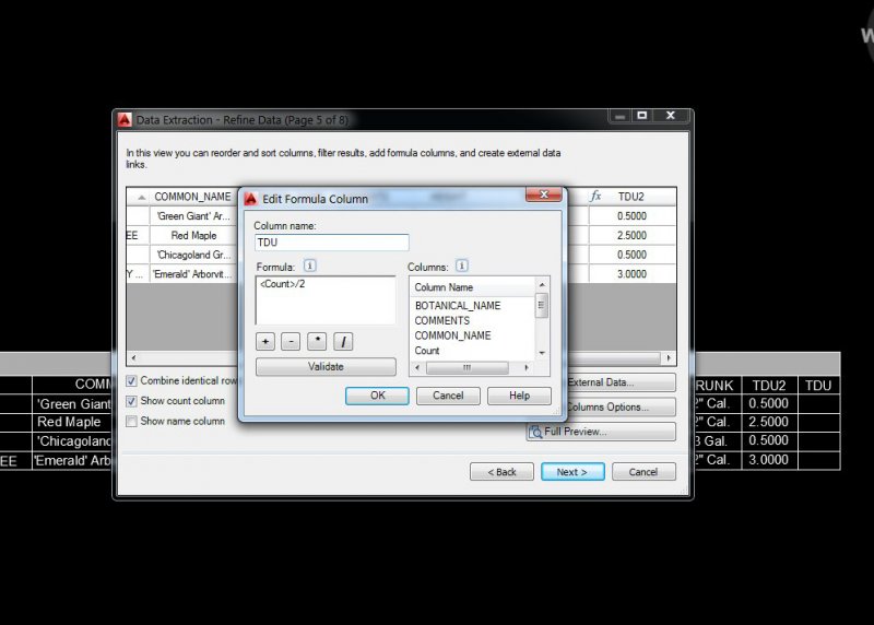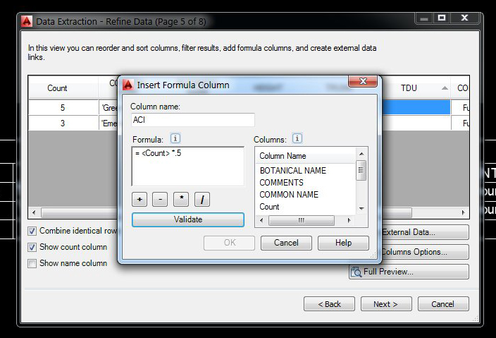 Deodar311 Posted May 7, 2015 Author Posted May 7, 2015 I continued to play around with the "Insert Formula Column" and finally managed to make it work. Even though Autocad reported an error, the formula worked. Do not put an equal sign "=" in front of the formula and it may work. When i tried to multiply the column "Count" by .5, the formula did not work, however by dividing the column by 2, the formula did work! Data Extraction has the potential to create a BOM, but it will take some effort. Quote