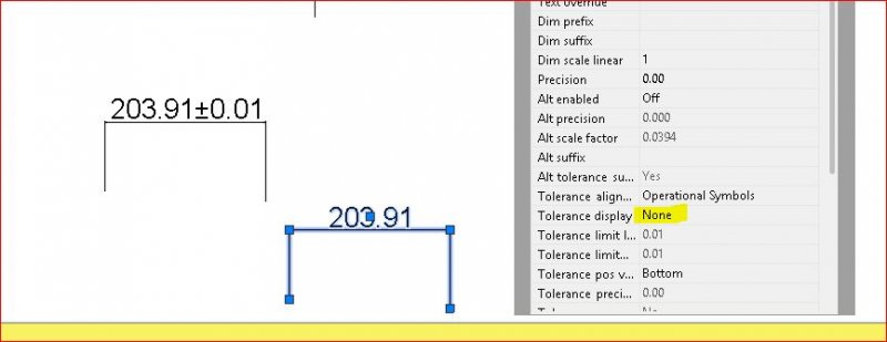 Dadgad Posted July 22, 2015 Posted July 22, 2015 Another way to affect the Tolerance display, selectively, would be by using your Properties, or Quick Properties (as shown with QPs) in the screenshot. The left hand dimension was copied, they are both the same dimension style, but on the right dimension I have turned off the TOLERANCE display, as highlighted in yellow in my quick properties palette. Quote