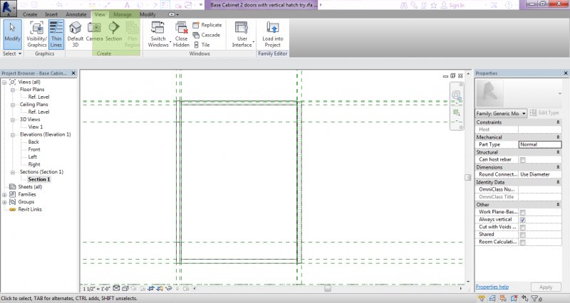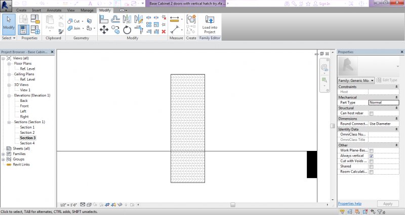 It's me again. And I got stuck with another hatch problem: Now, I put a hatch (worked fine) to a back of a base cabinet. I placed a vertical section, into the Family, and everything was fine. The hatch was scaled properly and it was visible on the "Section" view. But when I decided to place a hatch on the sides (of that base cabinet) I was not able to cut it (the cabinet) through horizontal section (plan section) to see if the hatch was fine. So, what am I doing wrong??? May be I am just too obsessed with AutoCAD workflow.