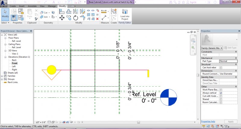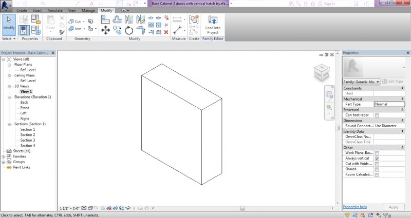 10. Then I decided to load that Family into a Project, to create a level through that base cabinet hoping that then I would be able to see the Cut Pattern (through sides and doors). Unfortunately I did not see anything.