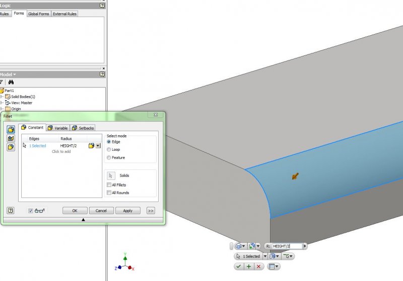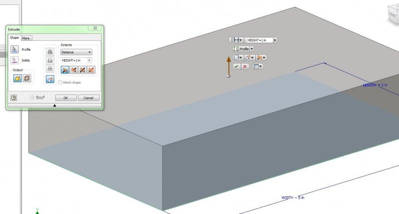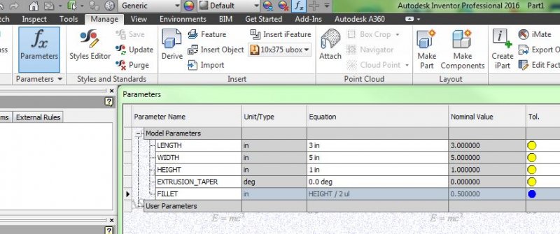 kpyoung333 Posted November 7, 2016 Posted November 7, 2016 Pretty simple, when you use the extrusion command type in HEIGHT=3.00 this will name the parameter for easier use. Whenever you use extrusion it creates a distance value and taper value (0.0 deg). You can then open Manage > Parameters to view/rename/edit the values. Setting the chamfer to be parametric is just HEIGHT/2. Quote