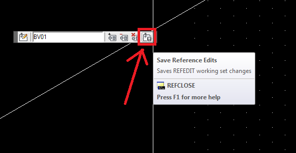 tmelancon Posted June 30, 2017 Posted June 30, 2017 If you are talking about REFEDIT then you should see REFCLOSE. See attached image. If you mean that you accidentally x'ed out of that little toolbar while REFEDITING, then type REFCLOSE . This should save and get out of REFEDIT. You can then proceed to run REFEDIT again to step back in and your toolbar should know be visible. Hope this helps. Quote