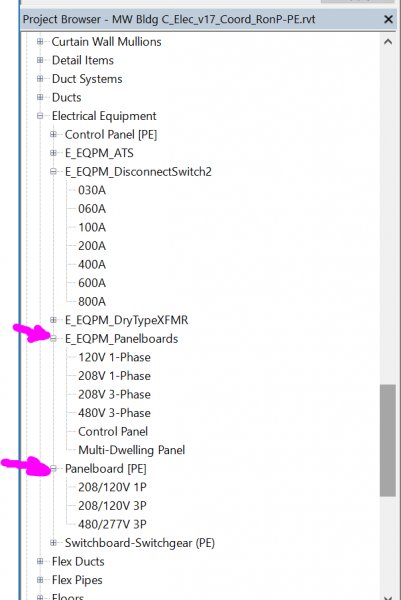 yrnomad Posted August 7, 2017 Posted August 7, 2017 I have a series of panels (Panelboard [PE]) that I'm trying to change to a different a newer panel family [E_EQPM_Panelboards], which has better label and clearance options. I have both in the same room, but when I pick Panel 2C11, which is the old family and do the dropdown in the properties box, I don't have that newer family as an option to choose. Anybody now why, or a workaround? Quote