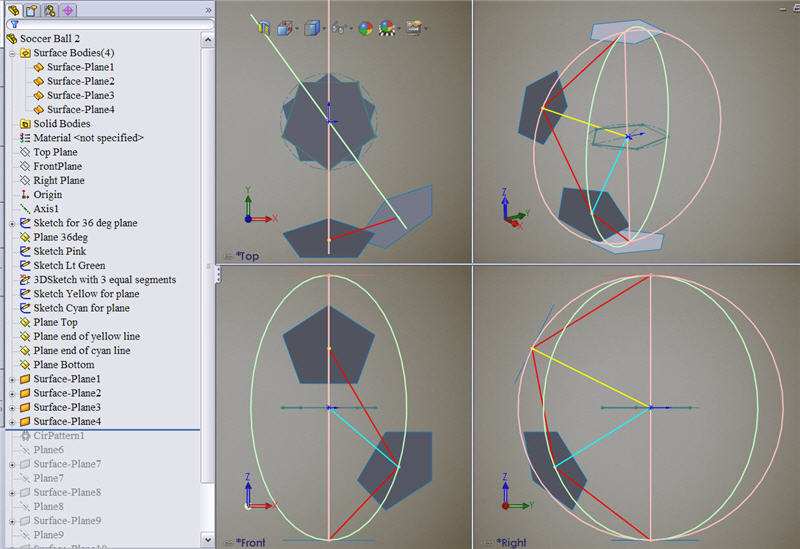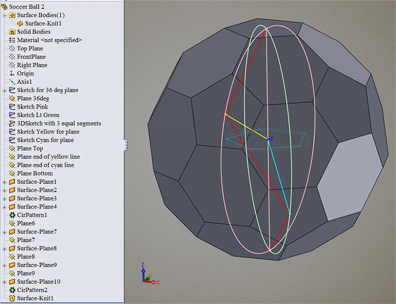 cedar Posted January 17, 2009 Posted January 17, 2009 I couldn’t stand it, I’ve seen soccer ball model so much and yet it looked so easy… I had to try. Once I started I saw why it is tricky… the bottom pentagon is rotated and the angle calculations have to include that rotation. My solution was to draw a 3d sketch (red) between the pentagon centerlines, top to bottom, and make the line segments equal. I cheated a little, I used a block for the pentagon sketch, and adjusted the block till all the sides were equal… kool to watch the whole ball update… but I did not calculate the proper side lengths with the sketches. I’m sure it can be done though. It’s not the sweep frame your drawing but the point is to use sketches and constraints to do complicated math. Quote