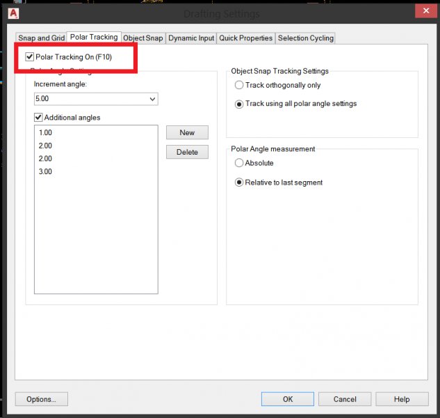rihiz Posted October 25, 2017 Author Posted October 25, 2017 Your aperture and pickbox may be sized a bit too large. Have you noticed that the cursor will sort of LOCK ON to the snap marker? Any further movement will break the lock. It happens pretty much right away as soon as you first come close enough to it. Also, don't click on the marker when is is dashed, only when it is solid lines. Try polar tracking with vector lines displayed. At least then when the vector lines are spinning crazily around the snap marker, you know you are not locked onto the snap. See the attached images. The first one is DSETTINGS (drafting settings). The second is OPtions > Drafting tab. Yes, I have a weird set of angles to track while polar tracking is active. I recommend 5 deg. at the smallest. I have to fix mine. I am not sure about how dyn input works in Iso. I don't use it much, but I think polar tracking may help you with 30 deg added to the tracking angle list. what exactly does polar tracking do ? Quote