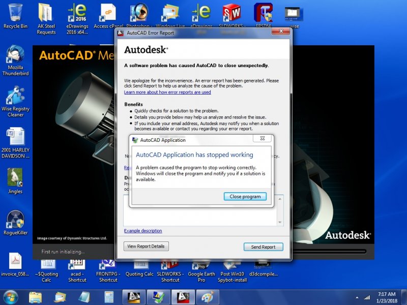 raceware Posted January 23, 2018 Posted January 23, 2018 I have a desktop with win 7 Pro installed on & had/have Autocad 2013 Mech installed on & working fine. Then I ran Wise Registry Cleaner on that came up with lots of problems which I had the reg cleaner fix. Well after the Cleaner did its job shortly after went to use Autocad & first error prompted : D3Dcomplier_43.dll missing can't find. So ent out on the web & installed the WIndows DirectX that installed the Dll file. Rebooted & attempted to run Autocad again & got error: Autocad won't start, I had got the Splash screen with First Initializing then the error. Opened Wise & restored Reg file but restoring the file didn't help same Won't Start. Reserach agin on web about the 2 stored Autocad creates when it gets registered may be corrupted to rename "*.old". Well that didn't work, so with that said I Uninstall 2013 Autocad & Fusion rebooted & re installed Autocad & Components rebooted attempted start of Autocad again same error: "won't start" splash screen comes up but never make it to register. Does anybody have a clue to fix it? Quote