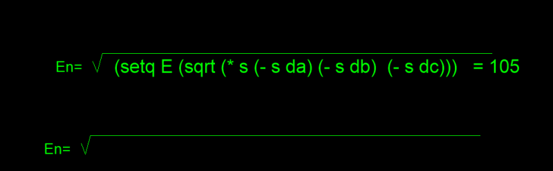Guest Posted July 3, 2019 Posted July 3, 2019 ;Using Heron's formula this is the calculation to find the triangles area. ;E= √(p(p-a)(p-b)(p-c) ;where p is half the perimeter: p= (a+b+c)/2 (defun c:heron (/ p E p1 p2 p3) (setq da (distance p2 p3)) (setq db (distance p3 p1)) (setq dc (distance p1 p2)) (setq s (/ (+ da db dc) 2.0) ) (setq E (/ (* (sqrt (* s (- s da) (- s db) (- s dc))) 2.0) dc) ) (princ (strcat "\n E = " (rtos (getvar "E") 2 2)" sqm")) ) Hi. i need some help with a lisp code. I want to calculate the area of some triangles with Heron's formula. Look the test.dwg Thanks test.dwg Quote
