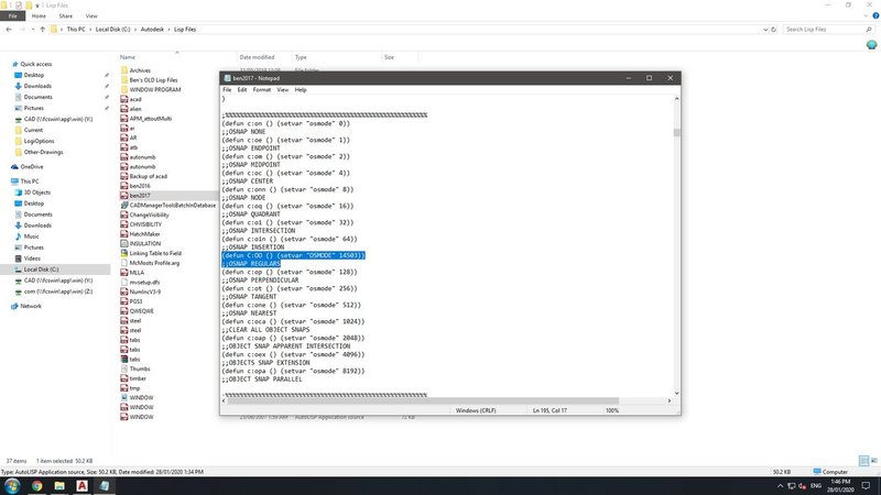 Scottie Fox Posted January 28, 2020 Author Posted January 28, 2020 On 1/24/2020 at 9:00 PM, tombu said: Putting OO in as a Command Display Name doesn't make it a command. Easiest way would be to add (defun C:OO ()(setvar "OSMODE" 14503)) to your acaddoc.lsp file. I've modified our 'Object Snap Cursor Menu' with a flyout for commonly used Osnap settings and toggles for a few other settings as well. Hi, Tombu. I tried searching Windows for the "acaddoc.lsp" file you mentioned but couldn't find anything, so I presume this is just the name you use (whereas mine is currently called ben2017.lisp)? I tried adding that command as you suggested but it's still not recognising it when I type "OO"; I've attached a screen shot of the edited LISP file I am using in my Startup Suite. Where am I going wrong? I tried closing and reopening AutoCAD with no luck. Also, I found an online course which seems to deal with Macros and the like: https://www.udemy.com/course/practical-autolisp-programming-beginner-to-advanced/ What do you guys think? Would this be an ideal course for me to take? Cheers. Quote