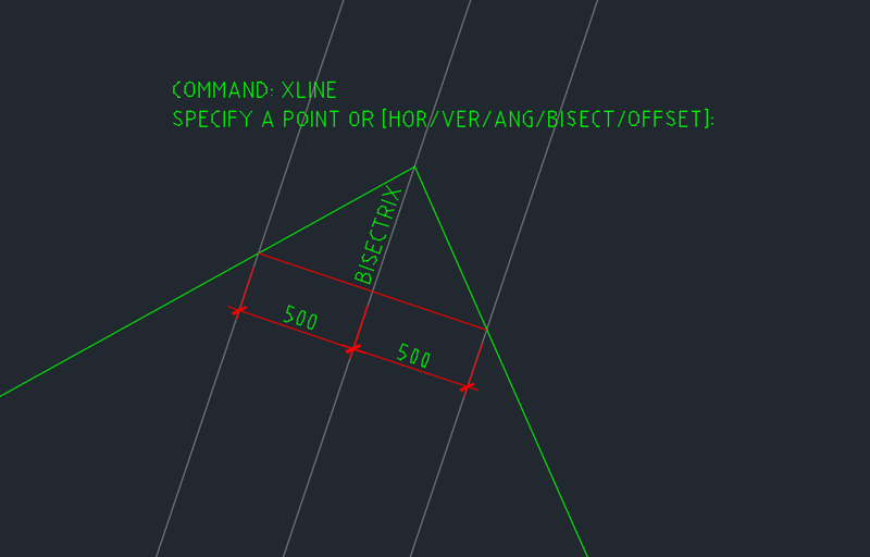 guran Posted August 6, 2020 Posted August 6, 2020 You draw a "XLINE / Bisect" through the intersection and offset the 0:5m in both directions. 1 Quote