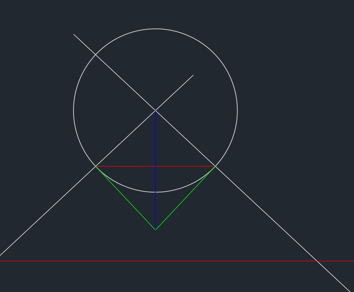 BIGAL Posted August 7, 2020 Posted August 7, 2020 (edited) Sin= 0/H Cos = A/H tan= O/A Others have a habit of answering. Of the top of my head 1/cos (90-118/2) * (dist / 2) = 5.83 So can work out point after using ang1 ang2 intersectwith for intersection point. Then polar 5.8331669860910269322409769334776 along in correct direction. If you use a circle and intersectwith will have problems. Edited August 7, 2020 by BIGAL Quote