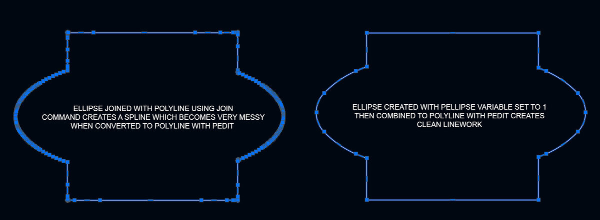 Cad64 Posted September 8, 2020 Posted September 8, 2020 5 minutes ago, Berzerker said: Thanks Cad64 I'll try that. I wasn't aware that you couldn't pedit a ellipse. They need to fix that! They should make it no matter what is drawn you can join it. If you want to use ellipse's and be able to join them to a polyline, you have to first change the setting of the PELLIPSE variable to 1. This tells Autocad to create the ellipse as a 2D polyline. The default setting is 0 which creates the ellipse as a 'True ellipse', which can't be used in a polyline. 1 Quote