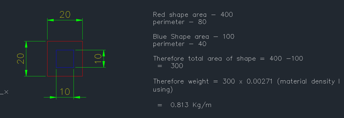 JimmyCoxy Posted December 7, 2020 Author Posted December 7, 2020 Hi Bigal, Not sure what you are talking of here. See below for a quick eg of what I am trying to do ie: Work out the weight of a simple 2D shape I can do it all long hand but want CAD to do this for me in a quick button press. Basically, I want to be able to select the outer shape (red) and then select any inner shapes (blue). CAD will then work out the area of the shapes and then also the weight. Once known, give it to me on an MText input so I can put it on the drawing. It is simple to do when using square shape but when shape is irregular, it is difficult. Quote