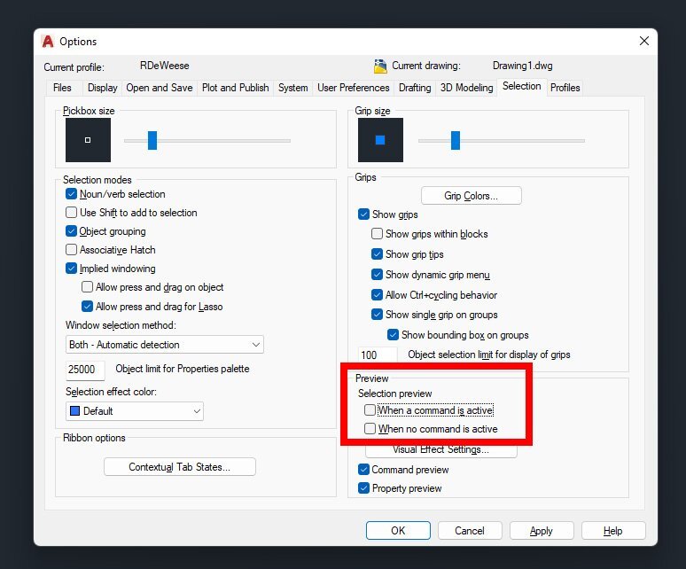 M76 Posted November 23, 2022 Author Posted November 23, 2022 That's the same as SELECTIONPREVIEW 0, it only disables it when no drawing command is active, so the exact opposite off what I need. Quote