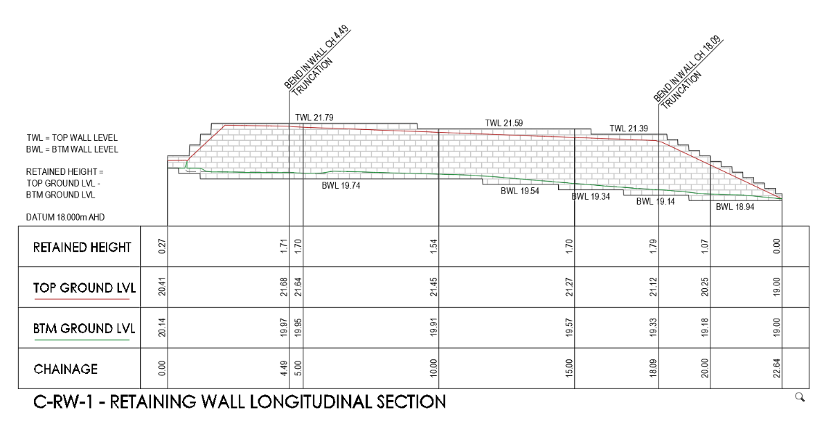 bhowitt Posted October 17, 2023 Author Posted October 17, 2023 Generally our workflow is: we will model walls in our corridor, then create longsections, then add in our top ground and bottom ground profiles (usually our design surface profiles at either side of the wall), then we will manually draw our stepped profiles (TWL & BWL) onto the profile view to simulate a block work wall, which can be quite tedious on larger sites when we have complicated walls spanning hundreds of metres. Hopefully this is clearer, otherwise I'll send over a sample DWG Thanks! Quote