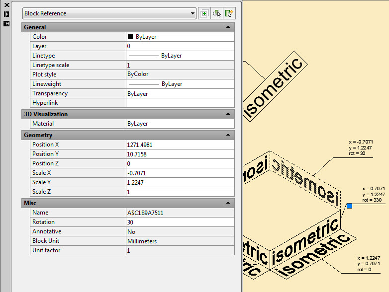 Maxelkat Posted September 16, 2013 Author Posted September 16, 2013 Hi Vagulus The scaling and rotation determine how the flat object is distorted to form the isometric object. This method involves initially rotating your object 45 degrees in order to independently scale in the x and y directions, thereby 'squashing' the object into the correct isometric shape. Any horizontal or vertical distances in the original object will be preserved by the method. If the object has text in it, end either the x or y scaling is negative, this will reverse the text (unless or until you explode it). Another way of getting reverse text is to set the MIRRTEXT variable to 1, and then mirror some ordinary text. Thanks for the interest Maxelkat Quote