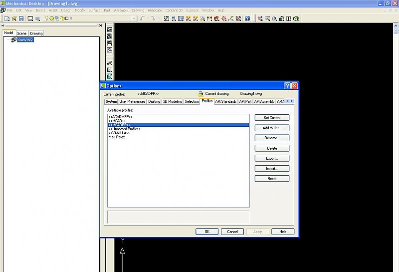 shift1313 Posted April 22, 2009 Posted April 22, 2009 looks like you might be on the acad profile. Go to Assist>Options, then i your options window go over to the profiles tab and tell me what profilie you are on. Here is a screen shot of the window. There are different profiles which make the program have a different interface. You can use MDT as if it were autocad(vanilla and acadmpp profiles). you can also create your own. Quote