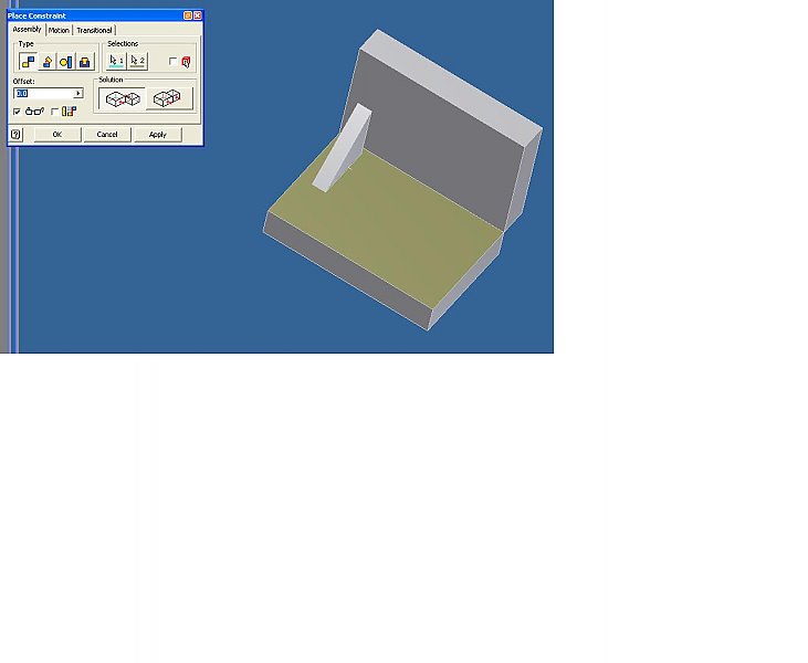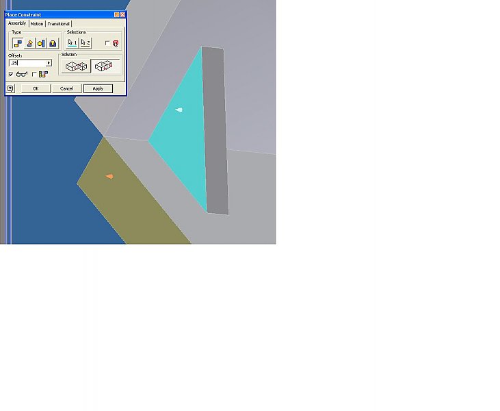 shift1313 Posted April 27, 2009 Posted April 27, 2009 alright here i did it using faces and an offset for the third constraint. I started with a coincident constraint placing the faces of the triangle with the faces of my plates(which were already constrainted). Then i added a mate selecting the two faces shown(take note of the direction of the arrow and your Solution box. The last picture is the same mate just with an offset added in. If my solution box had the arrow facing each other the offset would have pushed them apart. as a note, if you selected lines instead of faces for this same mate constraint you would have used two and it would have placed the gusset at the edge. Quote