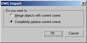 When the DWG Import dialogue box appears, click the "Completely replace current scene" radio button and click the "OK" button to proceed. This effectively creates a new MAX drawing from your AutoCAD original. The "Merge objects…" option can be used to add AutoCAD drawings to existing MAX drawings. This can be useful if you are constructing a number of elements in AutoCAD and then using MAX to assemble them into a scene prior to render or animation. However, in this case we have a single drawing object, so the "Completely replace…" option will do just fine.