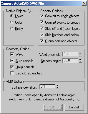 The Import AutoCAD DWG File dialogue box allows you to set a whole range of variables which determine how the AutoCAD drawing will be interpreted when it is transformed into a MAX model.