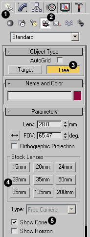 . The Control Panel will change to show the camera parameters. First of all you need to select the type of camera. On the "Object Type" rollout, click on the "Free" button to define a Free Camera. Place the camera in the Left viewport by clicking just above the model. Creating a Free camera in the Left viewport will automatically align the camera's line of sight with the positive world X axis. You need to do this so that the camera follows the path correctly.