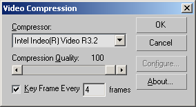 You can skip the Render Options section since the default settings will work fine and go straight to the Render Output section. We need to specify a file name to write the render information to. Click on the "File…" button to display the Render Output File dialogue box. Set the file type to "AVI File (*.avi)" using the "Save as type" drop-down list. Then, enter a file name in the "File name" edit box and navigate your way to the folder where you want the file to be created. Click the Save button. When you have done this, you will be presented with the Video Compression dialogue box. Accept the default compressor (Cinepak Codec bt Radius) and set the Compression Quality to 100 using the slider. AVI files can be quite large so it is a good idea to use some method of compression. However, there will always be a drop in the quality of a compressed image. If you don't care about file size, you have a fast computer and quality is of the utmost importance, you can set the compressor type to "Full Frames (Uncompressed)". The AVI file created with the settings above is 730KB (0.73MB). That's quite a large file considering it is a relatively simple scene, contains only 12 seconds of motion and is only 320x240 pixels in size. An uncompressed version of the same animation was over 40MB, 56 times larger than the uncompressed file! To continue, click "OK" in the Video Compression dialogue box.
