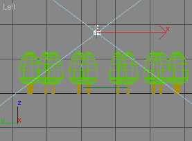 You now need to set the camera parameters. The first choice to make is the focal length of the camera lens. You can set the focal length manually using the "Lens" edit box on the "Parameters" rollout or you can set the field of view with the "FOV" edit box. However, you will usually want to use one of the stock lenses. Choose the lens you want by clicking on the appropriate button in the "Stock Lenses" section. Bear in mind that a 50mm lens will give you the equivalent field of view of the human eye. Focal lengths shorter than 50mm will give a wide angle view and focal lengths longer than 50mm will give a telephoto view. You will see that the stock lenses range from 15mm (Fish Eye) to 200mm which gives you a wide range of options. It's worth experimenting with focal lengths, some wide angle effects can be quite dramatic. For the purposes of this exercise, click on the "28mm" button to select a 28mm lens. Finally, check the "Show Cone" option so that the view cone of the camera will be displayed even when the camera is not selected. This will help you to determine what objects will be in the field of view at any particular time. The camera set-up is now complete and the view in the Left viewport should look similar to the illustration on the left.