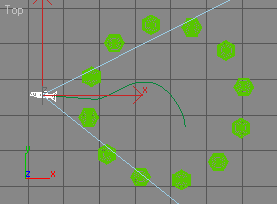 Finally, check the Follow box in the Path Options section. You may see the camera orientation change slightly so that it now points along the line. The Follow option must be checked so that the camera and it's target move along the line correctly. The Top viewport should now look similar to the one shown below.