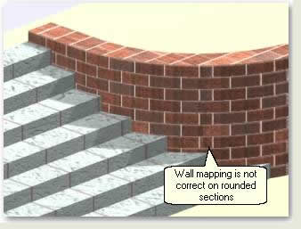 The illustration below demonstrates what happens when a brick material is assigned to a rounded wall created by extruding a closed spline. The mapping is 'Box'. Although sometimes this can be acceptable at a distance the bricks elongate around rounded corners and do not follow the curve correctly