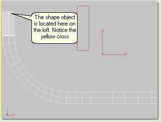 After creating the loft it will be necessary to modify the position of the section on the path spline. At present the rectangle is positioned so that it is lofted along its pivot point. This is the default lofting position. The pivot point on the shape object could be altered to the bottom corner of the rectangle. However, in this example the loft parameters are going to be used to adjust the rectangle's position