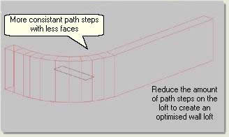 Often loft paths are positioned accurately in AutoCAD and the use of arcs is common (and indeed recommended). However, the use of arcs can produce non-uniform path steps along a loft and lead to an inappropriate number of faces
