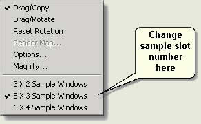 Select a sample slot by left clicking over it. When the sample slot is current (ie you can edit the material) it shows a white border. Change the Sphere to a Box by clicking the Sample Type Button flyout and choosing the Box Type