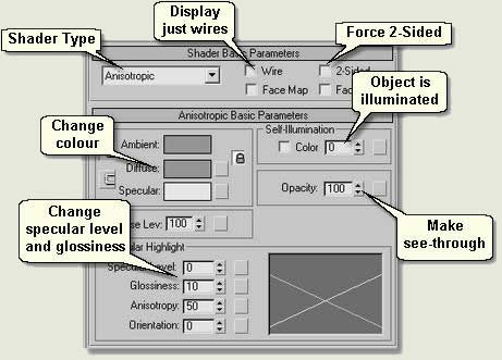 - Change the shader type to Anisotropic - this together with Metal are well used in landscape work. Shaders give different basic settings for materials. Explore the other shaders using the MAX/VIZ help system. The most useful settings for the Anisotropic shader are shown above