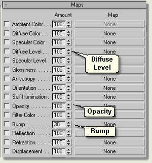 This is where various maps can be applied to the material. In landscape work the most used maps are applied to the Diffuse Level (all landscape materials) plus perhaps Opacity (for masking buildings, signs, vegetation etc images) and > or Bump (for giving relief to walls and paving)