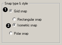 These options act in the same way as those in the respective commands described above, see The Snap Command and The Grid Command for details. If you are creating drawings in isometric projection, use the "Isometric snap" option to change the grids from the standard orthogonal square grid to a 30 degree isometric grid.