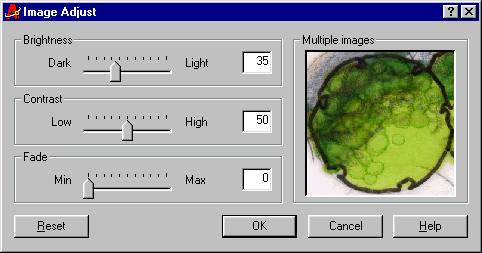 Notice that, in the Image Adjust dialogue box, when two or more images are selected, the image name above the preview is replaced by "Multiple images". If you try using this command with different images, only the first selected image will display in the preview area.