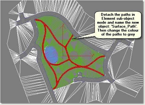 - In Element sub-object mode select the inner paths and detach these faces. Name the detached surface mesh: Surface_Paths