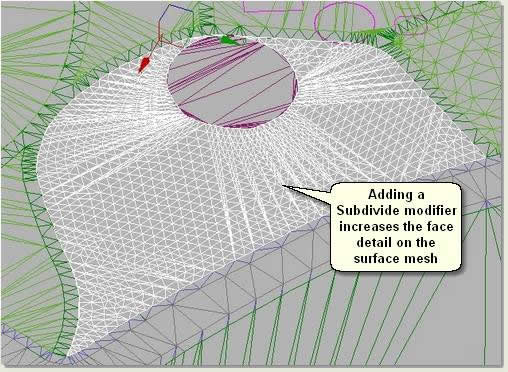 NOTE: The addition of contour data (within the 3D spline areas) when producing the 3D spline model puts extra design detail where required and helps to reduce this 'embankment' effect