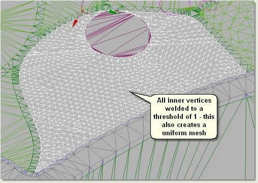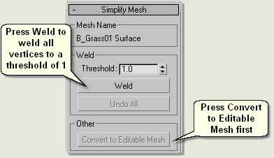 - Type 1 in the Weld Threshold spinner and Weld. All the vertices apart from vertices at the edge of the mesh are welded to a threshold of 1 (ie any vertices less than 1m apart are welded