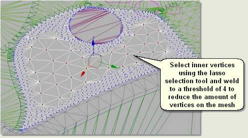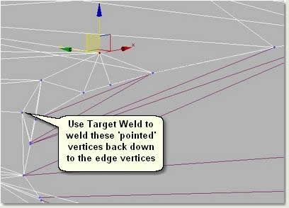 - Notice that on some sections the mesh vertices which are near to the edge have been moved up vertically creating an almost vertical pointed edge. Use Target Weld to move and auto-weld the offending 'points' back down to the edge vertices