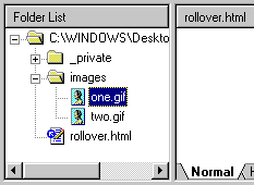 to reveal it. In both cases, make sure that you are in Normal view. In the example on the right, the image file, one.gif is dragged from the File List and dropped in the rollover.html window.